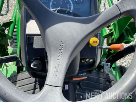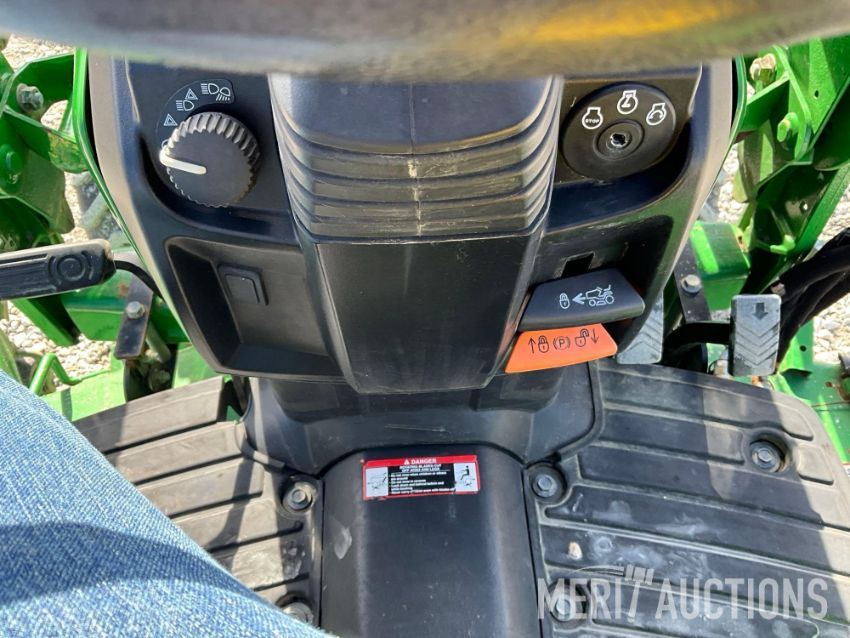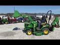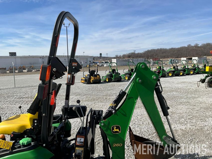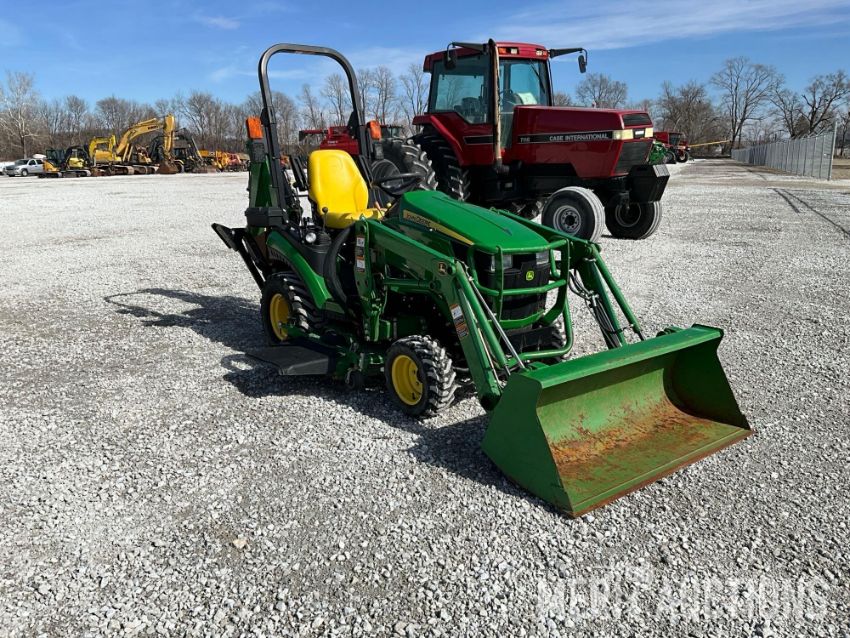 2015 John Deere 1025R MFWD Tractor with John Deere H120 Loader, 54in Loader Bucket, John Deere 260 Backhoe, 7in. Hoe Bucket, 60in. Belly Mower, ROPS, Hydrostatic Transmission, 26x12.00-12 Rear Tires, 18x8.50-10 Front Tires, 286 Hours, SN: 1LV1025RVFH312642