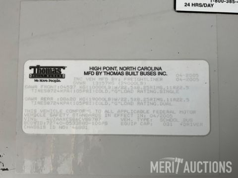 2006 Freightliner 30 Passenger Thomas Lift School Bus. 210hp Mercedes-Benz Engine, Automatic transmission, Air condition, Wheel Chair Lift, 11R22.5 Tires, 139,135 Miles. SN: 4UZAAXCS86CV88787