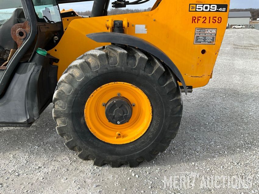 2013 JCB 509-42 Telehandler, 9,000lb Lift Capacity, 42ft Lift Height, 3-Mode Steering, Frame Leveling, Aux Hydraulics, Light Kit, Fender Kit, 6ft. Pallet Forks, 14.00-24 Foam Filled Tires, 6,710 Hours, SN: JCB5CFKGT01404603