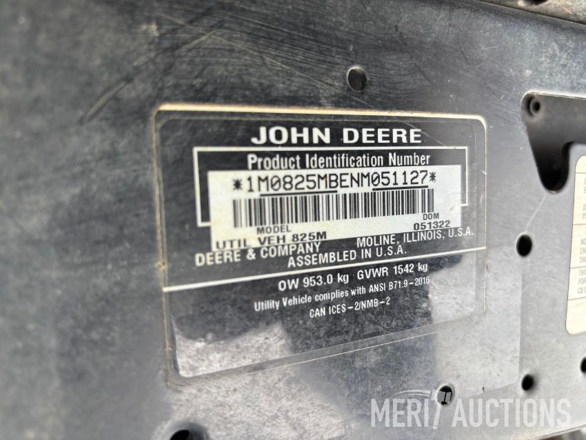 2022 John Deere XUV 825M S4 Gator, Hours: 496 4x4, 3 Cylinder Gas Engine, High/Low Range with Park Gear, Differential Lock, Manual Dump Bed, ROPS, Canopy, Receiver Hitches Front and Back, Lights, Windshield, Miles: 4,350: SN: 1M0825MBENM051127