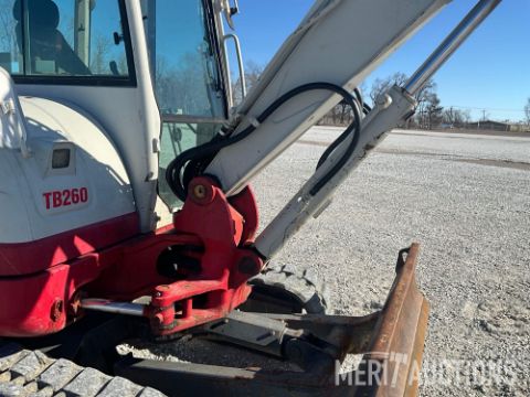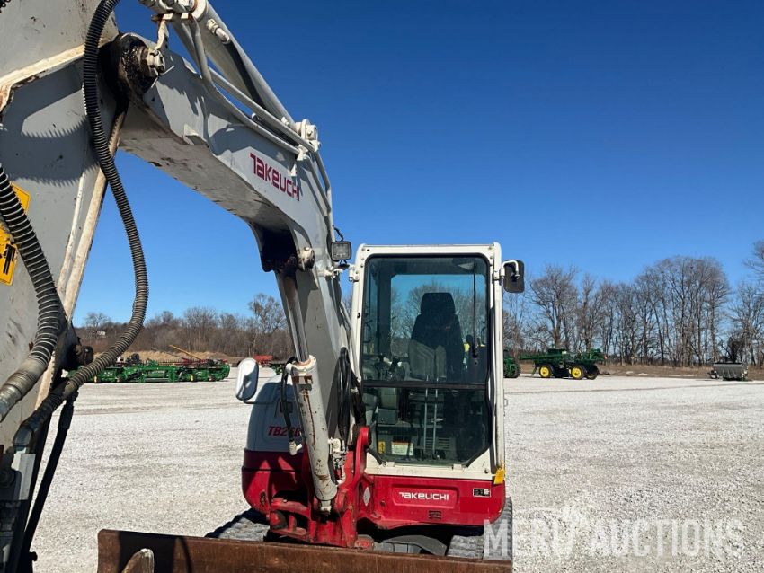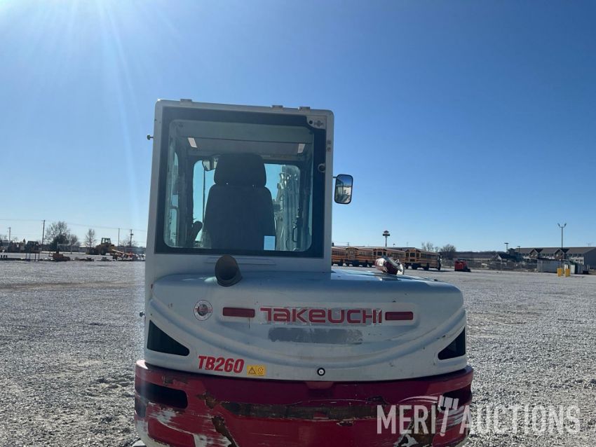 2019 Takeuchi TB260 Excavator, Hours: 2,601. Cab w/AC, 2-Speed Travel, 78in. Push Blade, Dual Aux Hydraulic Circuits, Hydraulic Thumb, Bucket Coupler, 17in. TAG Tooth Bucket, Radio, 16in. Rubber Tracks. SN: 126104156