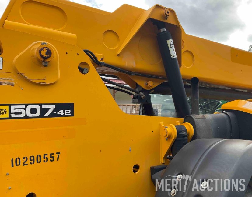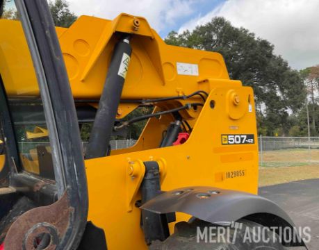 2014 JCB 507-42 Telehandler, Hours: 5,062. 3-Mode Steering, Frame Leveling, 7,000lb Lift Capacity, 42ft Lift Height, Aux Hydraulics, Fender Kit, Light Kit, 60in Forks, 14.00-24 Foam Filled Tires. SN: JCB5CEWGC02406235
